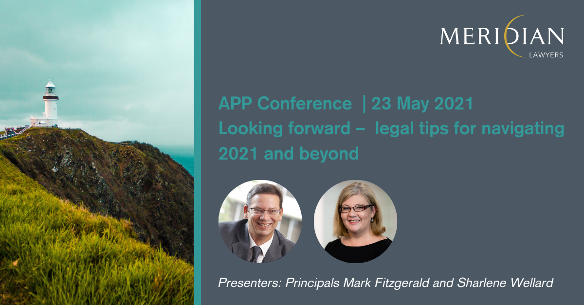 Join Principals Mark Fitzgerald and Sharlene Wellard at APP 2021 where they will share their top tips to help you navigate a range of legal issues that may impact on pharmacy businesses in 2021 and beyond.