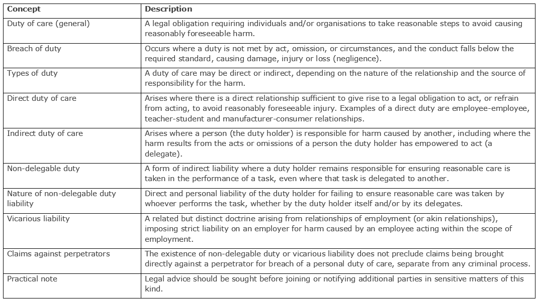 - Institutions (duty holders) that undertake care, supervision, or control of children and other vulnerable people, may now be held liable for intentional criminal acts committed by their delegates if reasonable care was not taken.[1]